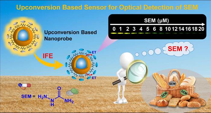 氨基脲是一种广泛存在的食品污染物,具有致癌和神经毒性,主要源于水产养殖中抗生素硝基呋喃酮的使用和面粉发泡剂偶氮二甲酰胺的热分解。虽然现有的光学检测技术具有快速响应和可视化检测的优势,但由于氨基脲没有荧光响应和紫外吸收,构建高灵敏度和可视化检测氨基脲的光学纳米传感器仍然是个挑战。为此,科研人员设计了一种基于上转换发光的纳米传感器,可用于氨基脲的视觉检测且具有较高的灵敏度和良好的选择性。该纳米传感器由上转换纳米粒子和磷钼酸组成,其中,磷钼酸为氨基脲的特异性识别元件。在0 ~ 16 μM的线性范围内,传感器对氨基脲具有较高的灵敏度和视觉响应。该研究建立的简单、通用的非辐射能量转移模型为食品中有害物质的检测开辟了一条新途径。