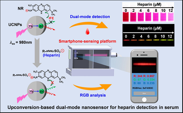 肝素是一种临床用重要抗凝药物,需要定期进行检测和剂量调整。常用的荧光法具有响应速度快、灵敏度高等优点,但大多数荧光传感器在短波长光源的照射下会产生自发荧光,易出现假阳性,同时,还存在制备复杂耗时、检测仪器昂贵等缺点。为此,科研人员研制了基于上转换纳米粒子的纳米传感器,用于肝素的荧光和比色检测。该纳米传感器对肝素的检测灵敏度较高,荧光模式下的检测限为0.1 nM,比色模式下的检测限为0.3 nM。此外,团队还开发了便携式手机传感平台进行肝素定量检测。这种纳米传感器依靠长波长激发和荧光-比色双响应检测信号消除自身荧光,有效提高了传感器的准确性,从而扩展了肝素的临床检测和相关医疗安全的应用。