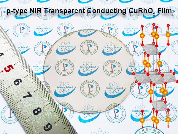 研究人员通过理论计算发现,铜铁矿结构CuRhO2材料是一种间接带隙半导体,Cu+的d轨道与O2-的2p轨道可进行杂化,从而减弱价带顶附近载流子的局域化,实现p型高电导率;另一方面该材料在可见光及近红外波段表现出弱的光吸收行为,具有高透过率。研究人员在前期金属型铜铁矿薄膜的研究基础上(Advanced Functional Materials, 30, 2002375(2020)),采用非真空工艺进一步获得了大尺寸p型CuRhO2透明导电薄膜。该薄膜表现出c轴自组装织构生长特征,有利于其在ab面内载流子的传输。另外,由于Rh3+大的离子半径可实现空穴型载流子重掺杂,使得Mg掺杂CuRhO2具有非常高的室温电导率(735 S/cm)、高的近红外波段透过率(85~60%)及低的室温方块电阻(4.28~0.18 kΩ/sq)。这种高性能的p型透明导电薄膜的发现,为后续基于透明n型及p型薄膜的高性能全透明异质结构筑及应用提供了一种潜在的候选材料。