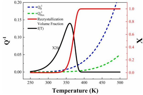塑性变形是提高金属材料力学性能(如强度、硬度等)的重要手段。然而,变形材料在高温下会发生再结晶过程,从而降低材料的强度和硬度。另一方面,通过再结晶退火能够消除冷变形引起的位错、空位、亚晶界等结构缺陷,这也是工业上控制金属材料组织和性能的有效方法。因此,确定再结晶温度对金属材料的生产加工和工业应用具有重要意义。传统的再结晶温度测定方法主要有金相法和硬度法,均需要对一系列样品在不同温度下进行一定时间的退火处理后,观察样品晶粒尺寸变化或测量样品硬度变化来测定再结晶温度。这些传统方法存在操作繁琐、试验周期长、材料成本高等不足。目前的研究表明,利用内耗技术对固体缺陷非常敏感的优势,可以探究变形金属的再结晶过程。然而,尽管连续升温再结晶内耗峰可以表征变形材料发生了再结晶过程,但该内耗峰峰温与等温退火过程确定的经典再结晶温度有很大的不同。
