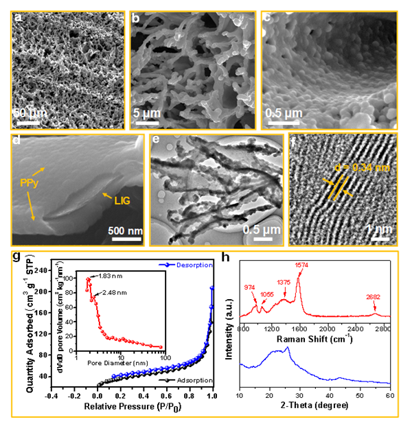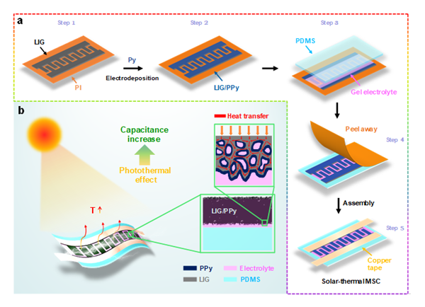 鉴于此,研究人员采用激光诱导技术制备了具有三维多孔结构的石墨烯晶体膜,并通过脉冲电沉积技术将聚吡咯均匀复合到多孔石墨烯导电网络内部,构筑了石墨烯/聚吡咯复合电极,其具有高比容量,且能有效利用太阳光热效应实现电极温度的快速上升等特点。在此基础上,研究人员进一步构建了一种新型光热增强型超级电容器,既能将电极材料充分暴露于太阳光下,又可以对固态电解质进行有效保护。在-30 °C的低温环境中,一个太阳光照射(1 kW m-2)下,超级电容器已严重衰减的电化学性能可以迅速提升至室温水平。室温(15℃)环境中,该器件在一个太阳光照射下表面温度提升了45 °C。温度提升后,优化的电极孔隙结构和增加的电解液离子扩散速率,使电容器的储电能力提高了4.8倍(比电容和能量密度分别达到2755.2 mF cm-2和21.55 mWh cm-3)。此外,由于固态电解质得到很好的保护,10000次充放电后电容器的电容保持率仍高达85.8 %。