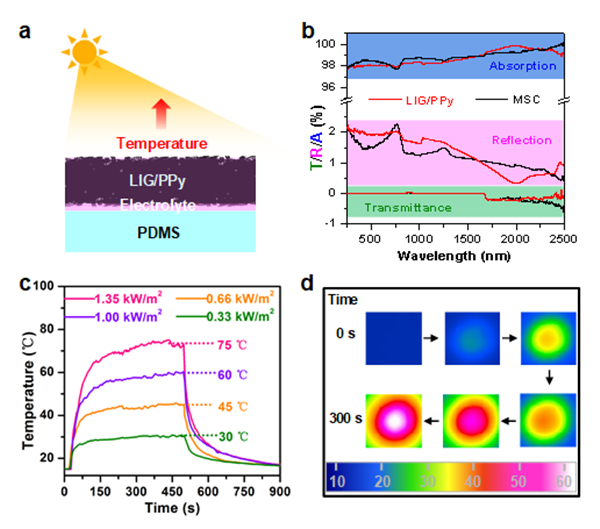 在低温环境下,由于电解液离子扩散受阻,超级电容器等储电器件的电化学性能会急剧衰减。而利用具有光热性能的电极材料,通过太阳能光热效应实现器件温度的快速上升,有望大幅提升超级电容器的低温性能。然而,开发兼具优异光热性能和高储电能力的电极材料依然是一个挑战。