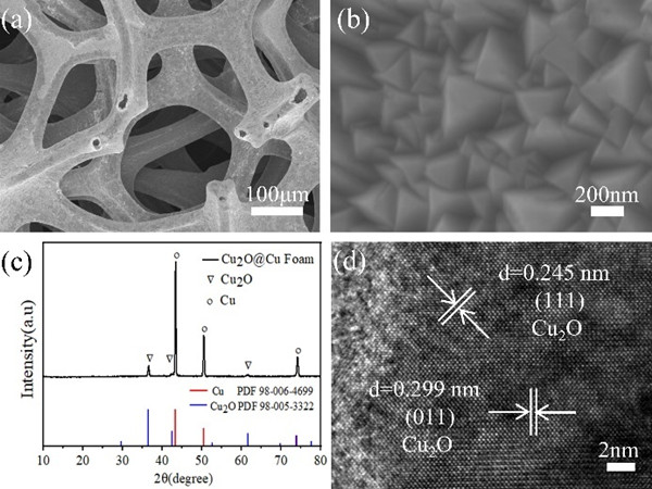 Cu2O@CF的(a-b) SEM,(c) XRD,(d) HRTEM表征结果。