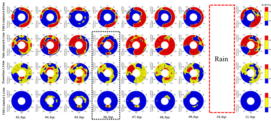 研究团队基于2D-MAX-DOAS和激光雷达在探测大气污染物空间信息方面的优势,于2020年9月在合肥市开展了大气关键污染物梯度探测和臭氧成因研究。研究了不同先验廓线型(指数型、高斯型和玻尔兹曼型)对2D-MAX-DOAS反演气体廓线的影响;并针对合肥市夏秋季典型臭氧污染过程,通过2D-MAX-DOAS获得的HCHO/NO2的空间浓度比值与臭氧的关系分析,揭示了对流层底层(< 2km)影响O3形成的主控因子空间特征,即:VOCs (地表)-NOx (0.4 km)-混合控制区 (1.0 km) -VOCs (1.6 km)。发现当臭氧浓度剧烈升高时,VOCs控制区占比扩大且合肥市区方向的敏感区域出现了强烈变化(NOx-limited→VOCs-limited)。考虑2 km高度内臭氧主控因子的影响,根据HCHO/NO2与ΔO3变化关系分析,大气中HCHO/NO2控制在5.50左右时臭氧可得到较好的控制效果(ΔO3≈-5 ppb)。该项研究对大气臭氧污染防治具有一定指导意义。