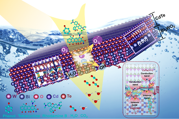 近年来,由于各种有机污染物的大量使用导致水体环境污染加剧。针对此类污染,课题组设计并开发了一种高效的碲化镉量子点/钨酸铋纳米片复合半导体材料作为光催化剂,用于治理有机污染物。项目团队通过在材料内部构建内置电场作为内在驱动力,促进材料内光生电子-空穴等转移,从而提高对苯酚、罗丹明B、四环素的降解效率,并且在短时间内基本实现降解。该催化剂直接利用太阳光作为光催化的驱动力,同时展现出良好的循环利用率,多次催化后仍可保持较高的光催化效率,在水体污染物治理方面展现出一定的应用前景。
