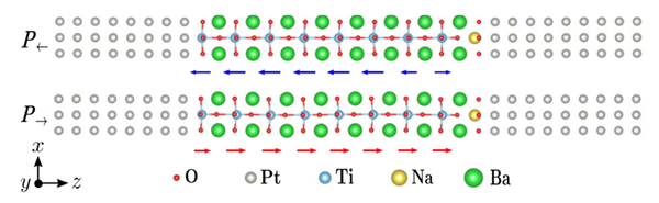 郑小宏研究员课题组在钙钛矿氧化物铁电隧道结Pt/BaTiO3/Pt的研究中提出,如果在隧道结的一侧界面引入负的极性界面,其引起的库伦势随距离的衰减将对铁电势垒的能带倾斜产生很大的影响,进而能够有效调控其输运性质和TER比率。研究发现,通过在铁电隧道结Pt/BaTiO3/Pt右界面即BaTiO3/Pt界面处用Na或Li替换Ti原子,可以形成带负电的NaO2或LiO2界面,最终可获得105 %量级的高TER比率。这是由于当铁电势垒左极化时,铁电极化本身引起隧穿势垒的能带从左到右升高,带负电的NaO2或LiO2界面对电子的库伦排斥作用将进一步推高铁电势垒中的电子能带,并且在靠近右侧界面处升高幅度最大,导致右侧界面处部分原子层价带顶上升到费米能级以上,从而实现部分金属化,因此在这一极化态下将获得一个低电阻态。然而当铁电势垒右极化时,尽管NaO2或LiO2负极性界面依然会推高电子能带,但由于此时铁电极化引起势垒的能带从左到右下降,因此两者的共同作用相互抵消,使得右侧界面区域的价带分布比较平坦并且价带顶始终在费米能级以下,左极化时右侧部分原子层的金属化将在右极化状态下消失,从而表现为一个高阻态。正是这种在一侧负极性界面的作用下,两种极化状态下的部分金属化的产生与消失导致了高TER比率,这一方案对设计高性能铁电隧道结具有重要参考意义。
