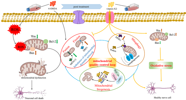 维生素K2在6-OHDA诱导的SH-SY5Y细胞毒性中的保护作用示意图