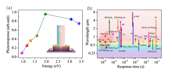 图1. 基于层状InSiTe3光电探测器的(a)光谱响应与 (b)已经报道的部分二维材料光电探测器的性能对比图。