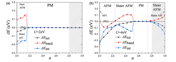 图1. Ba2CuO4-δ体系随参杂变化的磁相图:(a)U = 2 eV,(b) U = 4 eV。
