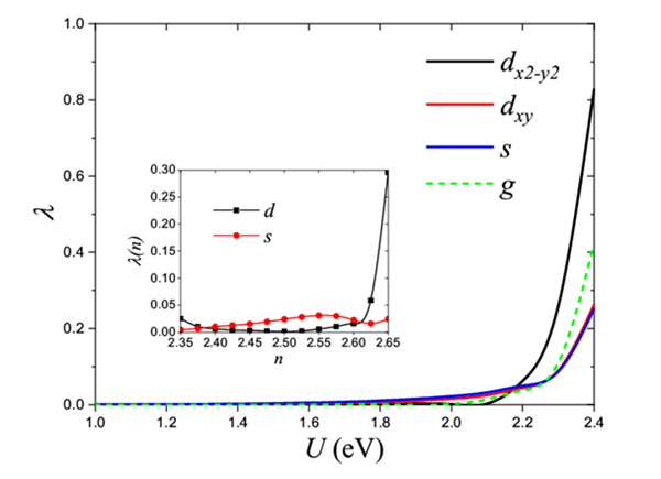 图2. 配对强度随关联U的变化,插图为U = 2 eV时, 配对强度随掺杂的变化。