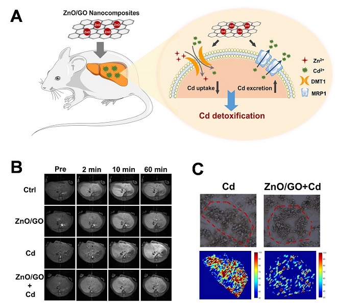 许安课题组长期致力于探索污染物诱导健康危害的干预措施和作用机制,在前期揭示了典型碳纳米材料氧化石墨烯拮抗污染物毒性的基础上(Environ. Sci. Technol., 2016; Environ. Sci-Nano, 2018),进一步对氧化石墨烯进行修饰和改性,设计合成了ZnO/GO 复合纳米材料。利用9.4T高场核磁共振成像系统可以对生物样本进行原位无损检测的优势,研究人员从小鼠活体、原位水平证明了ZnO/GO复合纳米材料可以高效、安全地拮抗Cd诱导的肝脏损伤,包括肝细胞吞噬能力以及胆道排泄效率的降低均可以得到显著恢复。体内外水平研究显示,ZnO/GO 复合纳米材料一方面通过释放锌离子竞争性抑制Cd进入细胞,另一方面上调多药耐药相关蛋白(MRP1)的表达和活性进而促进Cd排出细胞,最终通过降低Cd的生物累积进而高效、安全地拮抗Cd诱导的毒性效应。通过对比ZnO/GO 复合纳米材料与常见的抗氧化剂在拮抗Cd毒性上的效率差异,以及ZnO/GO 复合纳米材料对不同重金属的拮抗能力差异,研究人员证实了ZnO/GO 复合纳米材料在高效、特异、安全地拮抗Cd毒性方面的良好应用前景,尤其在应对职业暴露人群Cd中毒突发事件中具有重要意义。