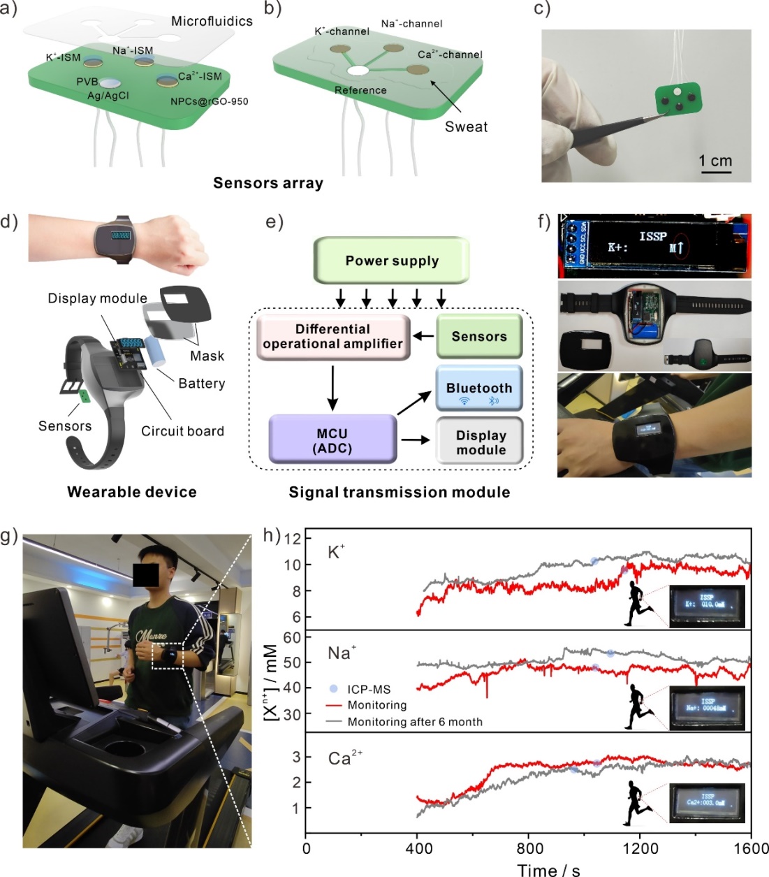 图. 监测汗液中电解质离子的全集成多路腕表:(a-c)三通道传感器阵列示意图和相应的光学照片;(d)全集成多路腕表的爆炸图;(e)包括电源管理、信号转导、处理、有线/无线传输到用户界面的传感器阵列传输组件的系统示意图;(f)志愿者佩戴的腕表以及相应内部的光学照片;(h)佩戴腕表的志愿者实时运动测试时的K+、Na+、Ca2+分析结果(红线)、半年后的监测结果(灰线)、相应的ICP-MS测试结果(圈)和显示实时监测模块照片(插图)。