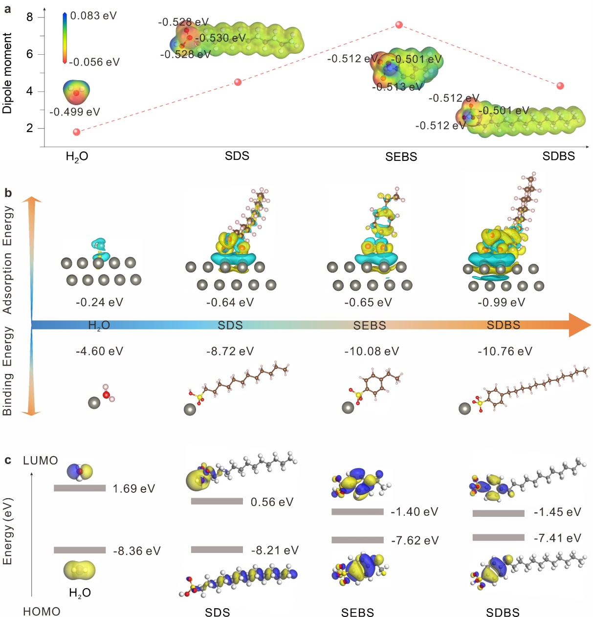 图1. (a)H2O、SEBS、SDS和SDBS分子中O原子电荷和分子DM值;(b)不同分子与Zn2+的结合能,以及不同分子在Zn表面的吸附能;(c)不同分子的LUMO和HOMO能级值。