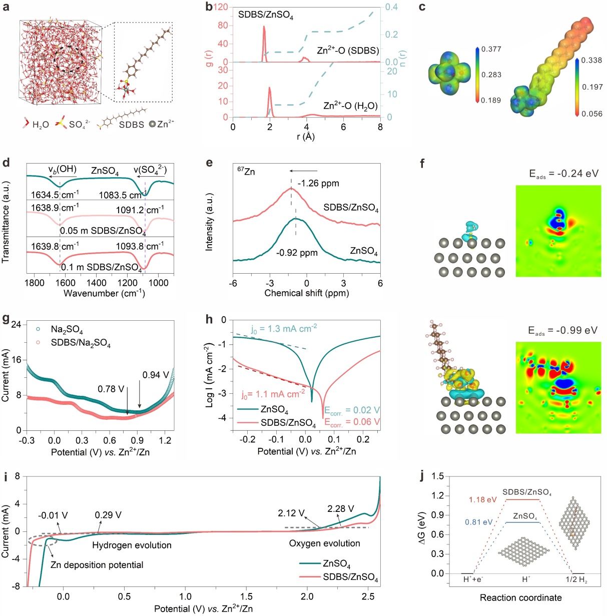 图2. (a)SDBS/ZnSO4电解液中MD模拟快照;(b)SDBS/ZnSO4电解液中Zn2+-O (添加剂)、Zn2+-O (H2O) 的配位数和RDFs;(c)不同溶剂化结构 (Zn(H2O)62+和Zn(H2O)5SDBS+) 的静电势;(d)不同电解液的FTIR光谱;(e)ZnSO4和SDBS/ZnSO4电解液的67Zn NMR谱;(f)锌表面H2O和SDBS的吸附能和相应的差分电荷密度图,黄色和蓝色分别表示电子的积累和损失;(g)添加/不添加SDBS时Na2SO4溶液的差分电容曲线;(h)ZnSO4和SDBS/ZnSO4电解液的Tafel曲线;(i)ZnSO4和SDBS/ZnSO4电解液的LSV曲线;(j)ZnSO4和SDBS/ZnSO4电解液的析氢能垒。