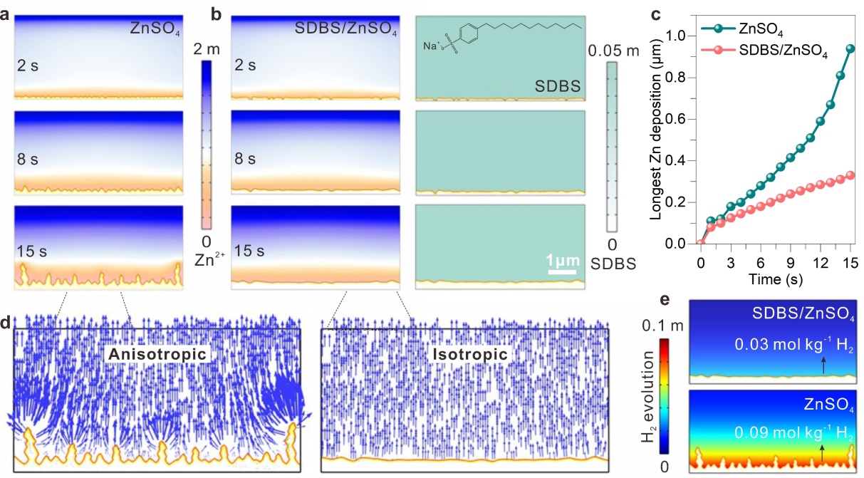 图4. (a, b)ZnSO4和SDBS/ZnSO4电解液中COMSOL模拟结果。(c)沉积过程中锌的厚度。(d)不同电解液体系中Zn2+的沉积取向。(e)锌沉积过程中的析氢量。
