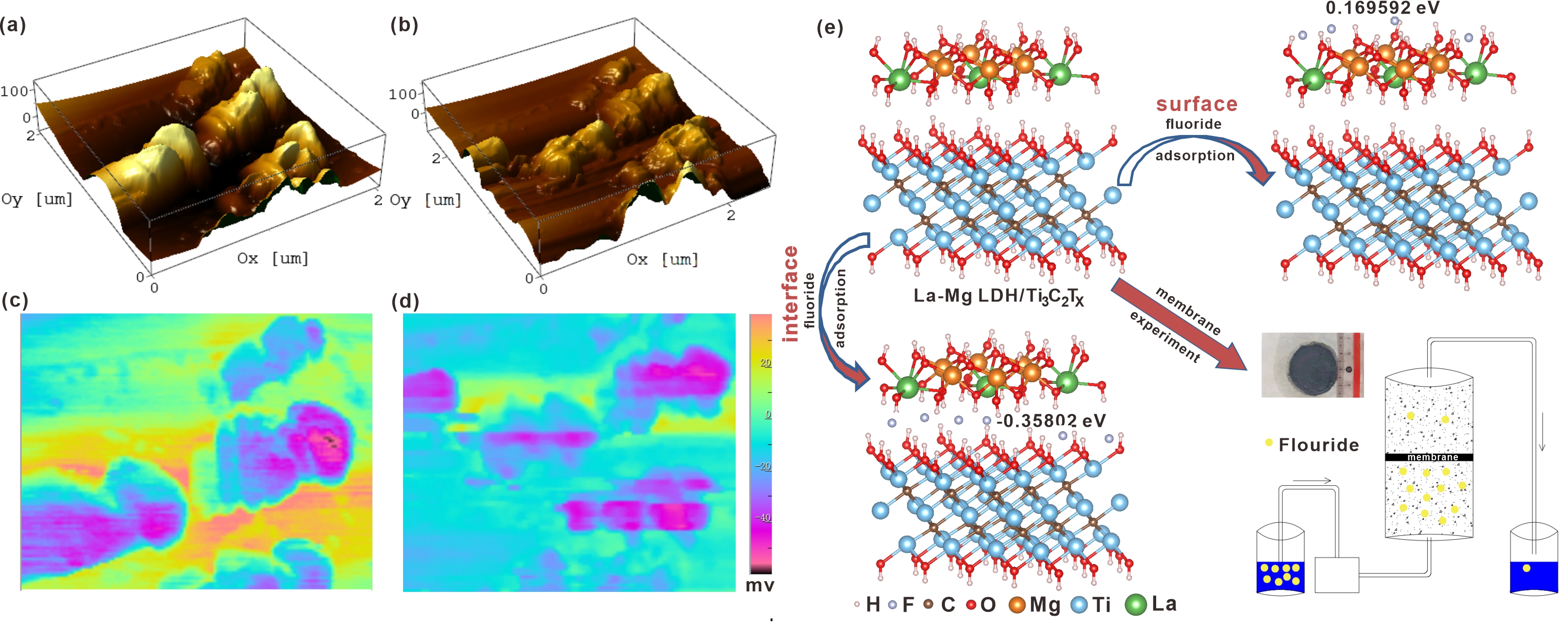 图2. La-Mg LDH/Ti3C2TX吸附前(a)和吸附后(b)的表面粗糙度图;La-Mg LDH/Ti3C2TX吸附前(c)和吸附后(d)的表面电荷图;(e)La-Mg LDH/Ti3C2TX吸附膜材料除氟机理图。