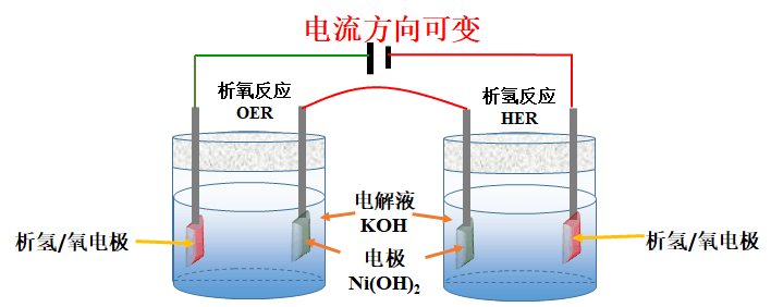 两步法电解水制氢关键在于高性能双极电极材料制备和电解槽结构设计。两步法电解水系统常用的双极电极材料是氢氧化镍,但其电子缓冲性能需要大幅提高以及充放电性能稳定问题,基于此,课题组采用简单的一步电沉积法在碳布基底上合成少量钴掺杂的柔性氢氧化镍双极电极。结果表明适当的钴掺杂能提高电极电导率和电子缓存性能,并能引起电荷再分配,并且避免在初始产氢过程中发生寄生的产氧现象[1]。