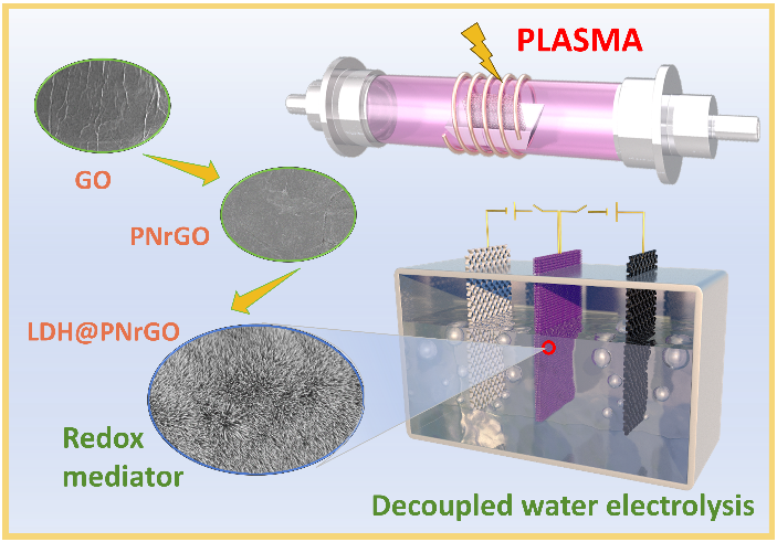 层状双氢氧化物是一种高容量电极材料,但其有限的电容量和固有的差导电性及稳定性限制了其在储能领域的应用。目前对层状双氢氧化物电极材料的修饰方式有多种,然而往往比较繁琐或是需要严苛的高温条件以及有毒/污染性的化学试剂。基于此,课题组采用绿色且高效的低温等离子体技术辅助制备了氮掺杂镍钴层状双氢氧化物和氮掺杂还原氧化石墨烯/镍钴层状双氢氧化物双极电极,有效提升了电极的电容量和导电性等性能[4,5]。