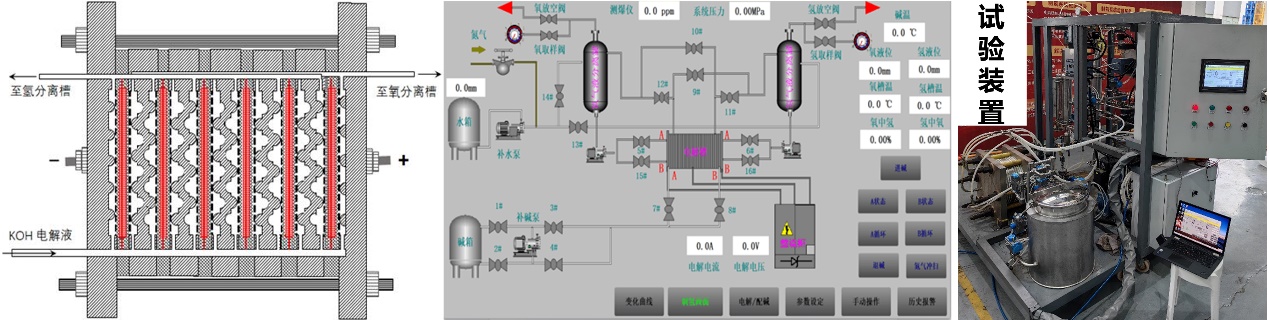 图3. 双极电极为隔板的压滤型电解槽(左),全自动控制系统(中),两步法电解水装置(右)