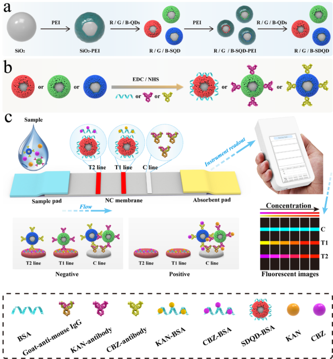 免疫层析试纸条由于低成本、便捷的特性是最具前景的现场快检技术之一,然而灵敏度不足、半定量等问题限制了其在痕量小分子检测中的应用。研究团队基于PEI自组装技术制作R/G/B三种不同颜色的复合量子点硅球标签,将绿色和蓝色荧光标签作为检测探针、红色荧光标签作为封装探针,构建了一种新型竞争性双通道变色免疫层析(CFICA)。同时,匹配开发了手持式荧光读取仪用于CFICA条带上多色信号的定量读取。CFICA系统在兽用抗生素卡那霉素和杀菌剂多菌灵的联合检测中表现出良好的效果:在多种实际样品(牛奶、茶叶、湖水和土壤)中,卡那霉素和多菌灵的检测限分别低至1.98和12.82 皮克/毫升(低于0.02微克/千克,高出现有最大残留限量至少100倍),展现出了良好的应用潜力。
