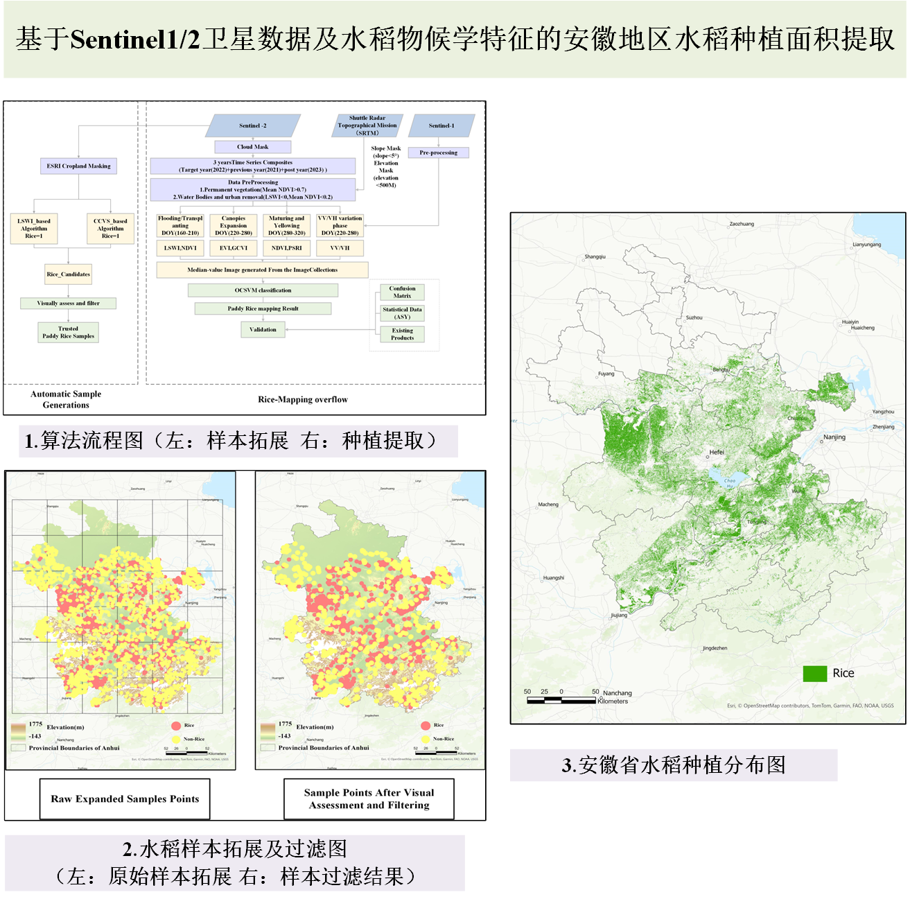 近日,中国科学院合肥物质院安光所光学遥感研究中心遥感信息表征技术研究室团队利用水稻年际物候学特征以及相关物候阶段的植被指数特征提取,通过机器学习分类算法对安徽省水稻种植面积进行提取并制图。