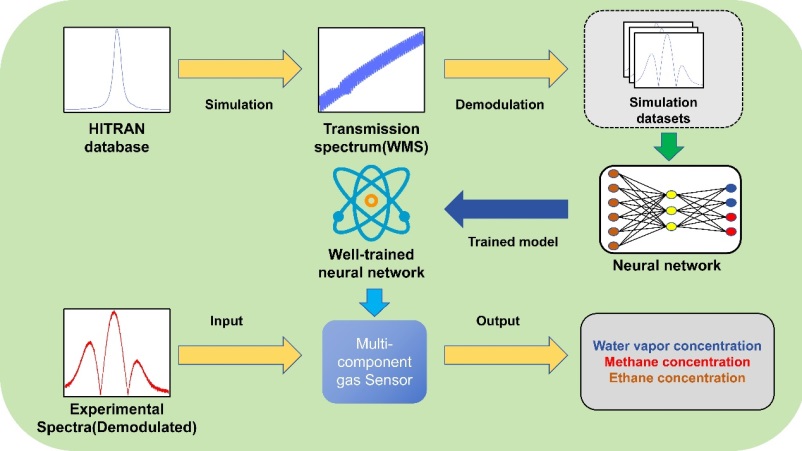 团队成员王贵师副研究员和博士熊昊提出了一种基于神经网络的混叠光谱解耦算法模型,使用单个激光器实现了对甲烷(CH4)、水蒸气(H2O)以及乙烷(C2H6)的同步检测。利用迁移学习的训练策略,使用大量的模拟数据用以提高模型的泛化能力,并且少量的实验数据被用于模型的校正,以满足实际检测的需要。经过实验分析,该模型在不增加任何额外的硬件设备的情况下,有效的解决了吸收谱线交叉干扰的问题,极大的提高了系统在复杂环境下稳定性。因此,基于神经网络的智能抗混叠干扰方法有望为多组分气体同步检测提供新的方向。