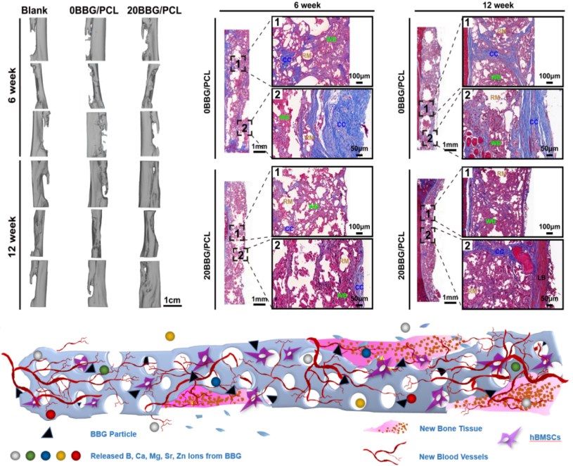 在骨组织修复中,研究团队利用BBG的独特理化特性,结合生物支架体BCC单元设计了含有不同BBG含量(0%、5%、10%、20%和40%)的定制BBG/PCL复合材料,并通过选择性激光烧结(SLS)技术3D打印出高质量的骨缺损修复支架。系统评估了这些BBG/PCL复合支架的孔隙几何形状、孔隙率、机械强度、亲水性、蛋白质吸附、降解行为、体外细胞相容性、成骨分化行为及体内生物学性能,以用于大段骨缺损(CSBD)修复。实验结果表明,BBG的加入显著改善了支架的综合性能,包括适宜的孔隙率、机械强度、亲水性、体外降解速率、细胞相容性、成骨分化能力及体内成骨和血管生成的生物学性能。研究发现,20% BBG含量为材料性能的最佳配比,20BBG/PCL复合支架表现出68.5%的孔隙率、650微米的孔径和0.860 MPa的压缩强度。