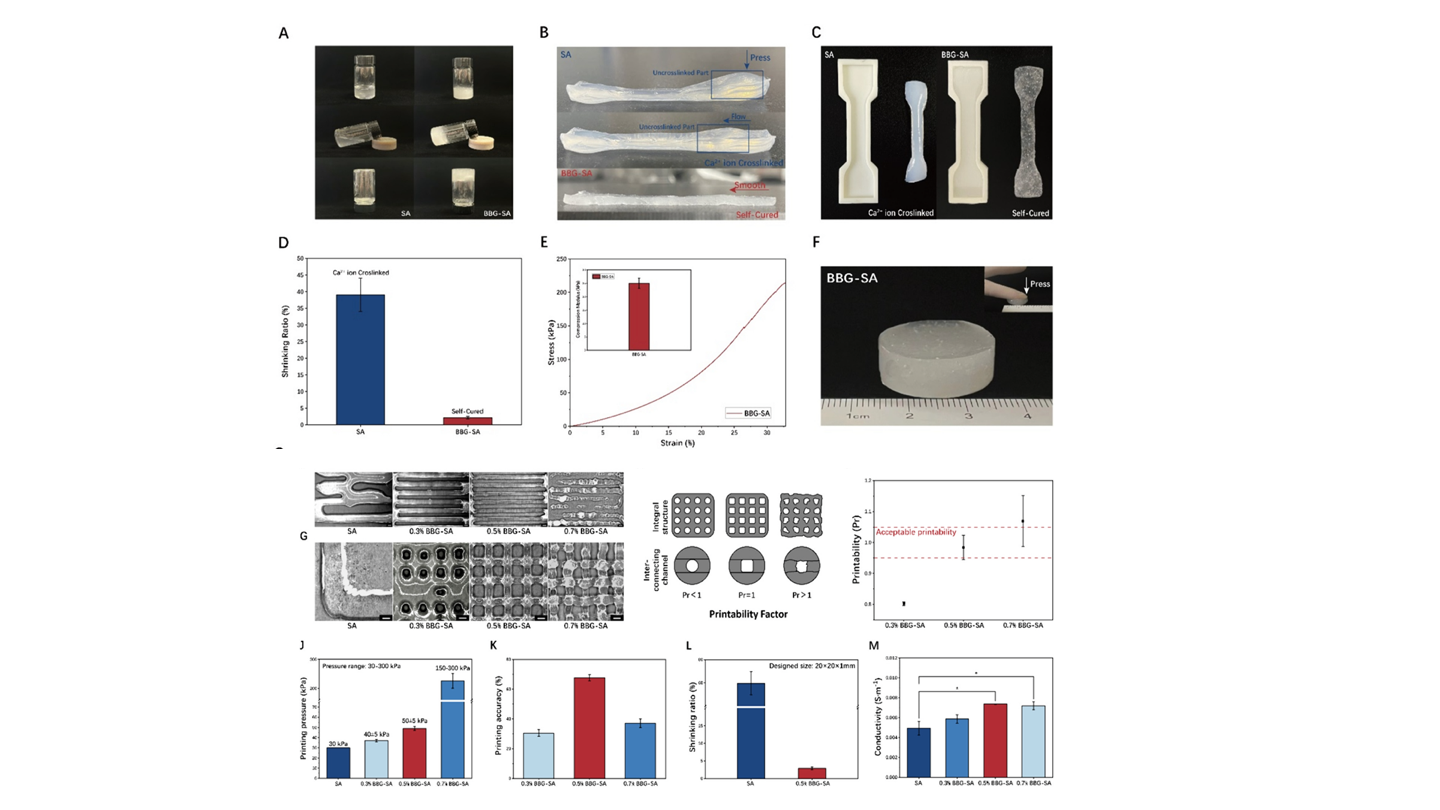 在软组织修复中,团队基于对BBG的特殊内外生物矿化特性的深入研究,将BBG颗粒引入海藻酸钠(SA)中,构建了高精度3D打印的BBG-SA生物墨水。研究表明,BBG与SA结合后,能够有效诱导降解并释放Ca²⁺,启动SA的内部凝胶化过程。同时,BBG作为填料解决了传统使用氯化钙(CaCl₂)进行外部交联时造成的凝胶化不均匀和显著收缩问题。通过挤出式3D打印技术,团队设计了含有不同BBG含量(0%、0.3%、0.5%、0.7%)的3D打印水凝胶复合支架,并系统评估了BBG-SA水凝胶的流变特性、打印精度和成型收缩情况。结果表明,添加BBG显著改善了海藻酸钠在3D打印中的低打印精度和成型收缩问题,其中0.5% BBG-SA配方表现出最佳的可打印性、打印精度和成型收缩,展示了在组织工程3D生物打印中的应用潜力。这些新型生物墨水还展现出优异的生物相容性,增强了MC3T3-E1细胞在支架表面的黏附和增殖,并促进了软组织相关基因和蛋白质的表达。