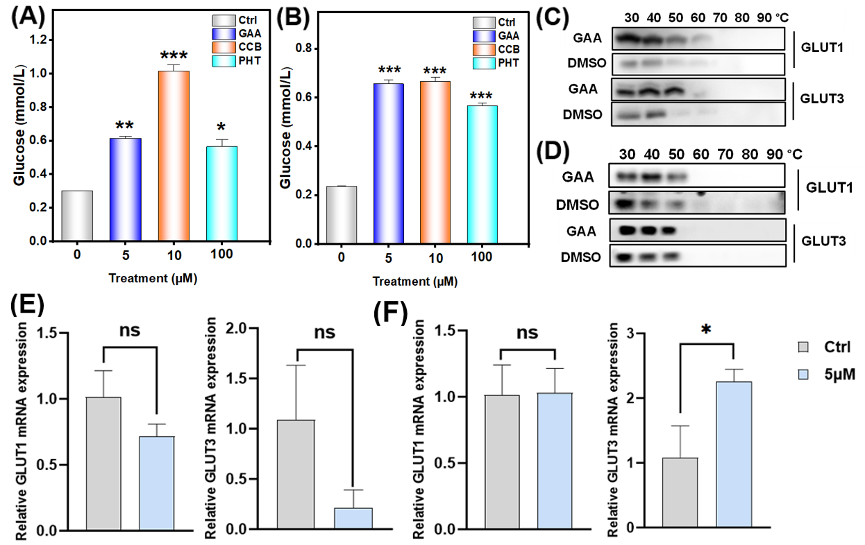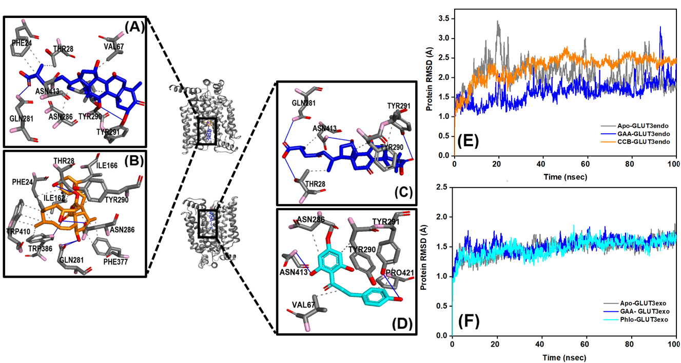 在这项研究中,研究人员重点关注两种关键的葡萄糖转运蛋白,GLUT1和GLUT3,由于癌细胞快速分裂时对葡萄糖的需求增加,许多癌细胞中会过表达GLUT1/3。通过采用辅助计算技术,包括用于蛋白质建模和分子对接的AlphaFold2,研究人员证明了GAA可以有效地结合GLUT1和GLUT3,并且当这些转运蛋白在溶液出现不同构象时,仍然可以嵌在蛋白内表面而稳定存在。进一步,他们通过人肺癌细胞实验证实,GAA确实可以显著降低了人肺癌细胞的葡萄糖摄取,而这种效果类似于已知的GLUT抑制剂如细胞松弛素B(Cytochalasin B )和根皮素(Phloretin)的作用。
