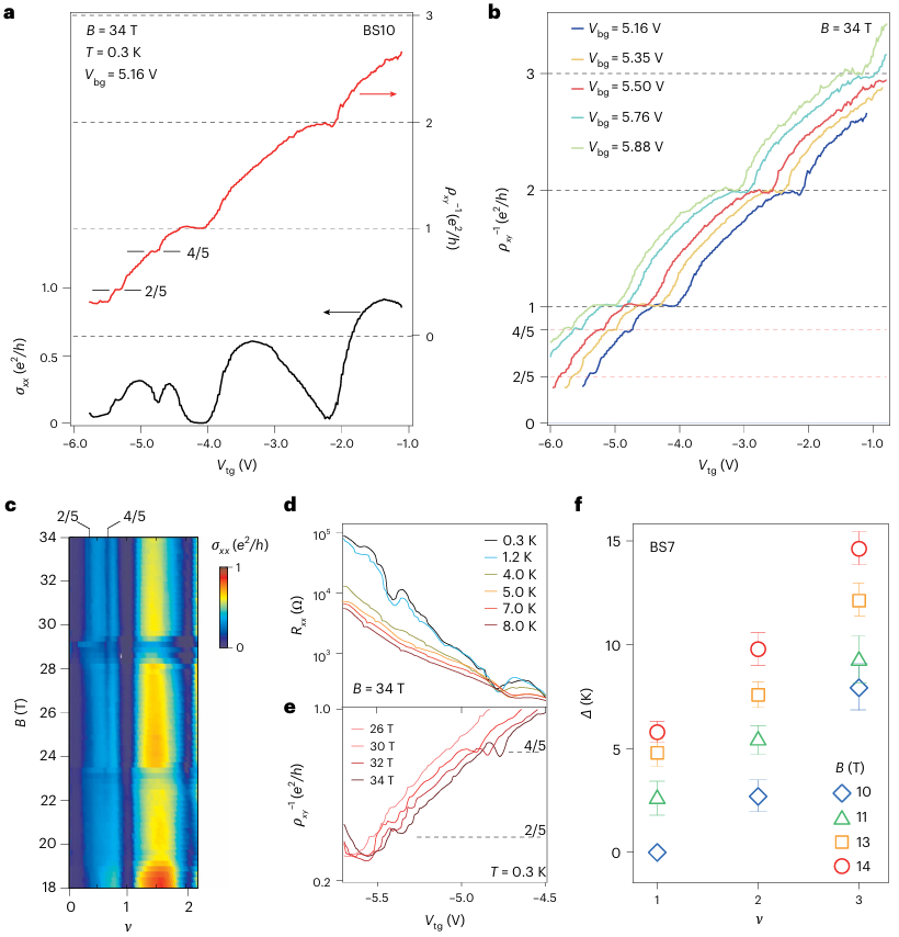该研究团队将硫化钼少层晶体在手套箱中用氮化硼进行封装,其中顶部氮化硼薄层采用预图案化的二维微米尺寸窗口进行铋电极热蒸发接触。所得器件在较低载流子浓度即可具有全温区(毫开尔文至室温)欧姆接触和高迁移率。在SHMFF 34 T 水冷磁体下,利用低噪声极低温输运实验测试系统,观测到填充系数niu=1的量子极限和⅖、⅘填充的分数量子化横向电导平台。这是目前能够通过电输运(非拓扑平带体系)观测到分数量子霍尔效应的首个二维本征带隙n型半导体材料。实验结果为基于二维半导体的低温高迁移率电子晶体管(HEMT)、低温放大器等纳米电子学器件提供了可能方案。