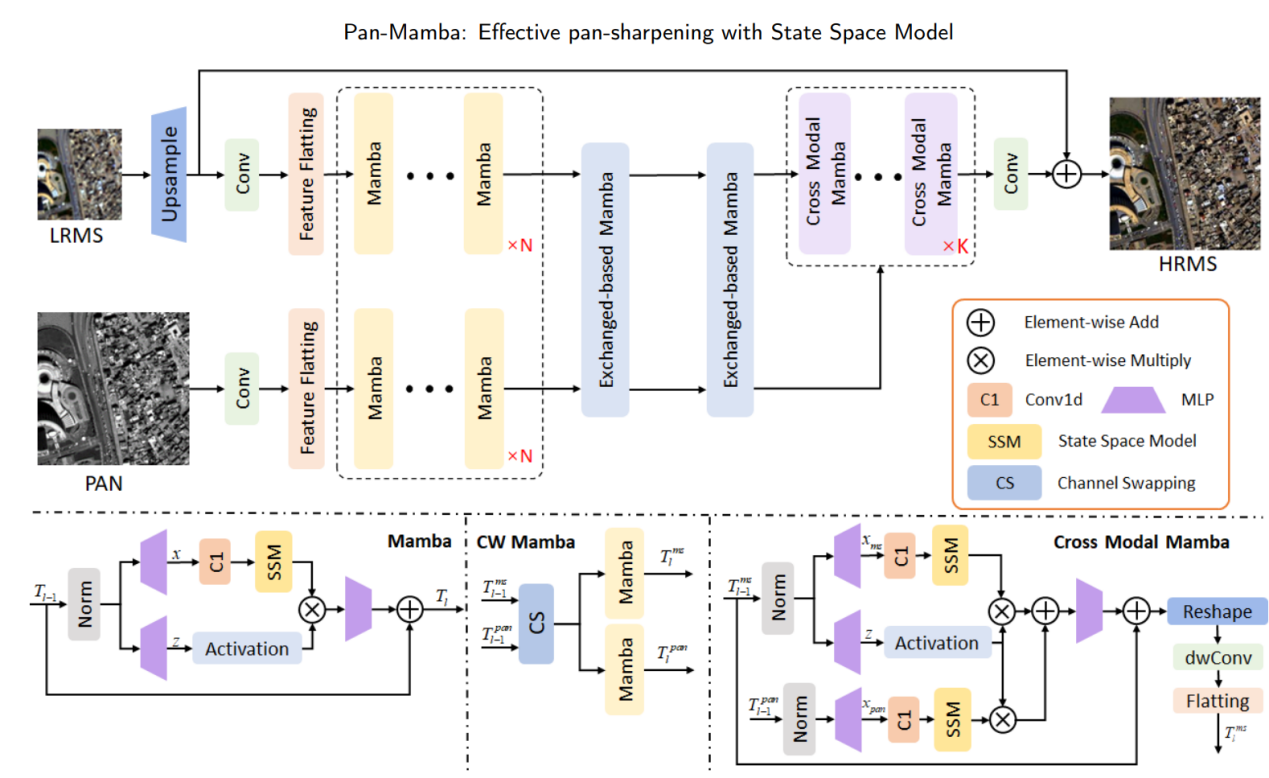 全色锐化是一项关键的遥感图像处理技术,旨在通过融合低分辨率的多光谱图像和高分辨率的全色图像,生成高分辨率的多光谱图像。近年来,Mamba模型在长程依赖建模方面取得了突破性进展,它能够以线性复杂度实现对长距离关系的建模,并且在众多领域展现出的效果与计算复杂度更高的 Transformer 架构相近。受此启发,研究团队将 Mamba 模型引入全色锐化领域,期望挖掘其在该领域的潜在价值。