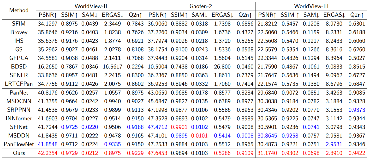 表 1Pan-Mamba模型在不同数据集下的实验结果