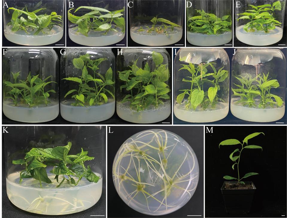 科研团队通过以带腋芽的杜仲茎段为初始外植体,通过直接再生途径,实现了杜仲的高效再生(图1),其中芽诱导率为100%,芽增殖率高达500%,且4周就实现了芽的伸长和增殖,这标志着杜仲再生效率的显著提高。此外,为解决杜仲再生过程中不定根诱导困难且基部伴有愈伤组织形成导致后期再生苗移栽成活率低的挑战,团队研发了杜仲组培苗两步生根技术,使得杜仲在11天即能生根,且不定根诱导率达到93.02%,显著缩短了杜仲优良种苗的生根时间,提升了杜仲再生种苗的质量。本研究建立的微繁技术体系为优良杜仲种质资源的保存、种苗的工厂化生产和后期的品种改良提供了技术支撑,同时也为难生根树种的细胞工程育苗提供了借鉴。