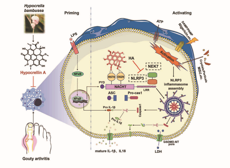 在本研究中,科研团队构建了抗炎药物的细胞筛选模型,并对实验室拥有的中药单体库进行了高通量筛选,发现了一种具有高抗炎活性的中药单体——竹红菌甲素(Hypocrellin A)。体外实验证明,它是一种具有高抑制活性且特异性较强的NLRP3抑制剂,其直接作用于NLRP3蛋白的NATCH结构域,阻断NEK7与NLRP3蛋白的结合,从而抑制NLRP3炎症小体的组装活化,Arg578和Glu629是其发挥作用的关键结合位点。体内研究显示,竹红菌甲素在MSU诱导的痛风性腹膜炎和痛风性关节炎小鼠模型中都具有较好的疗效。在痛风性腹膜炎模型中,它显著减少了中性粒细胞浸润并抑制炎症因子分泌;在痛风性关节炎模型中,它在消肿、镇痛、抑炎和改善病理等多个层面发挥了良好的治疗效果。综上,本研究揭示了民族药用真菌竹黄的主要活性成分竹红菌甲素对NLRP3炎症小体活化的抑制作用,阐明了其发挥抑炎活性的药理学机制,评价了其在痛风小鼠模型上的治疗效果,为民族药竹黄的传承使用提供了理论基础和实验依据。