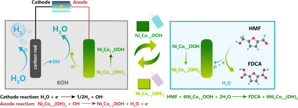 基于此,研究人员提出了一种两步解耦系统,在无强碱、无膜条件下驱动了HMF高效氧化。通过引入NixCo1-x(OH)2作为氧化还原介质,在两步解耦体系中实现了HMF向2,5-呋喃二甲酸(FDCA)的无碱转化(图1)。这种解耦策略能够成功耦合两种不同电解质中的反应:碱性电解质中的析氢反应和HMF水溶液中的HMF氧化反应。在该两步系统中,H2和FDCA的单独生产有效地解决了强碱和膜带来的挑战。