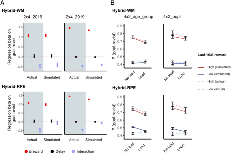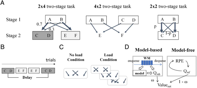 通过行为实验和计算建模的方法,该研究揭示了:个体决策中习惯性策略(无模型强化学习,model-free reinforcement learning)与目的性策略(基于模型的强化学习,model-based reinforcement learning)的权重由可用的工作记忆资源决定。研究团队提出了一种新型混合强化学习模型(Hybrid-WM reinforcement learning model),将工作记忆资源的有限性纳入决策机制的计算框架中。相较于传统强化学习模型,该模型不仅能够成功模拟任务负荷和延迟时间对决策行为的经典影响,还能更精准地拟合实验数据。此外,该模型在独立验证数据集上的表现进一步支持其广泛适用性。