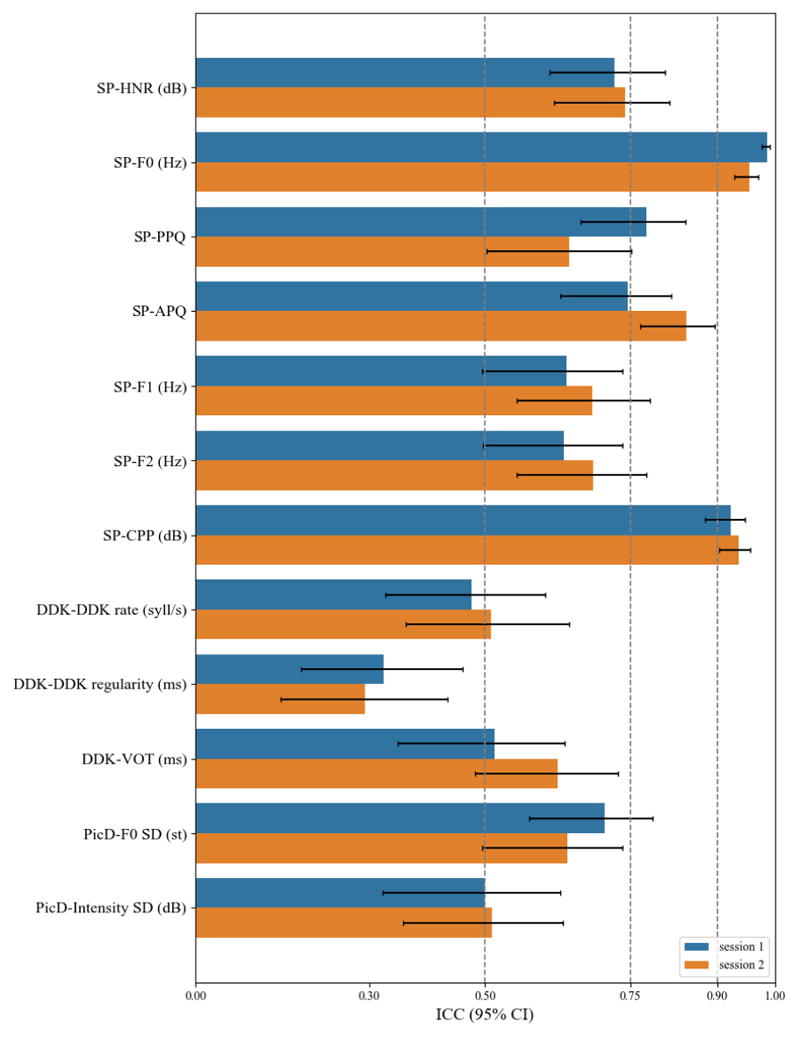 为填补这一研究空白,研究团队选取了家庭环境中常见的四种消费级设备(包括录音笔、笔记本电脑、平板电脑和智能手机等),对言语声学特征的跨设备和重复测量一致性进行了详细分析。研究结果显示,频率相关特征(如基础频率和倒谱峰突出)在设备间和重复测量中具有较高的可靠性,因此更适合应用于远程评估场景。相较之下,音节分割类的复杂特征(如音节速率和规律性)的可靠性相对较低。