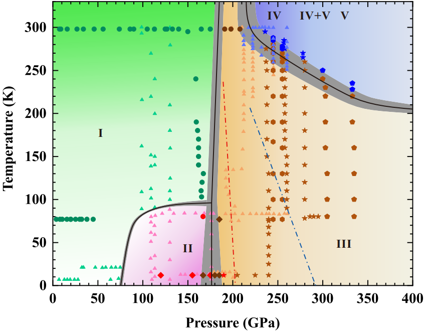 一直以来,氢和氘的高压相图是凝聚态物理领域的热门研究方向,在很宽的压力和温度范围内被广泛研究。目前实验上已经发现了氢的五个高压固相(相I、II、III、IV、V)。然而对氘化氢(HD)的高压相图研究却仍存在诸多疑惑,亟待完善,甚至存有争议,如相HD-IV*和相HD-PRE是否存在,是否存在其他新相。