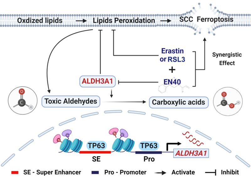 研究人员首先通过TCGA来源的鳞癌患者样本、鳞癌细胞系和ALDH3A1敲降后的鳞癌细胞非靶向代谢组数据分析,均发现ALDH3A1的高表达与抗铁死亡相关的信号通路呈现正相关性,分子生物学实验证明ALDH3A1通过代谢毒性醛的方式降低细胞内的脂质过氧化水平发挥抗铁死亡作用。同时,利用裸鼠移植瘤模型结合鳞癌类器官模型等实验发现,敲降或EN40联合铁死亡诱导剂具有协同杀伤肿瘤的能力。机制方面,研究人员通过表观遗传修饰和生化分子实验分析,发现鳞癌驱动性转录因子TP63直接结合在ALDH3A1的超级增强子和启动子区促进其转录活性。更有意思的是,敲降TP63的细胞中过表达ALDH3A1能够回复因TP63下调引起的脂质过氧化增加,提示鳞癌细胞利用其驱动性转录因子TP63上调ALDH3A1以抵抗细胞内脂质过氧化介导的铁死亡过程。