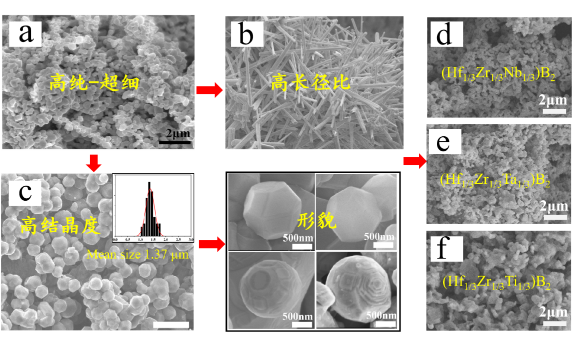硼化物超高温陶瓷因其极高的熔点、高抗氧化性和优异的耐腐蚀性成为热防护领域的最佳候选材料之一,而研制高性能硼化物陶瓷复合材料的前提是获得高品质的陶瓷粉体。通常高纯度和细粒径的陶瓷粉体能够大大提升烧结过程中的驱动力,进而实现相对较高的烧结密度,提升其力学性能。因此,获得高品质陶瓷粉体的关键是实现硼化物陶瓷粉体的纯度、粒径、结晶度以及形貌的可控制备。为实现这一目标,固体所陶瓷粉体研究团队经过长期攻关,开发了一系列基于前驱体-碳/硼热还原的工艺路线,围绕陶瓷粉体“纯(纯度)-径(粒径)-晶(结晶性)-形(形貌)-相(相结构)”等主要粉体性能参数,成功制备了IV-VI族过渡金属的单元/多元/中高熵陶瓷粉体。