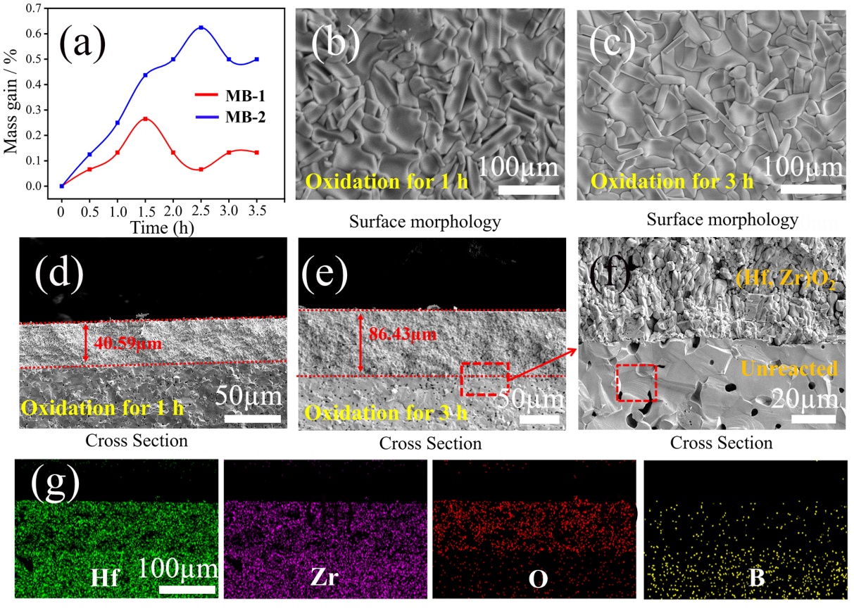 在没有出现新型高性能超高温材料前,如何提升现有超高温陶瓷材料性能,以满足新一代超高速飞行器热防护要求,成为迫切需要解决的问题。为此,研究人员通过高压液相共沉淀共辅助硼/碳热还原法合成具有良好形貌和高结晶度的阿基米德多面体(由两个或多个具有等效顶点的正多边形组成的凸多面体)陶瓷粉体。合成的硼化物陶瓷颗粒晶体结构完整、结晶度高、物理性能优异,减少了缺陷,大大提高材料的机械和电学性能,同时良好的分散性提高了材料的致密度。得益于高结晶度多面体形态,粉体消除了晶界弱化效应,可避免晶界处优先氧化,烧结后的陶瓷体表面形成多分支MO2保护层,显示出优异的抗氧化性。通过阿基米德多面体粉体制备的复合材料在1400°C下氧化3小时的陶瓷氧化层厚度为86.43 μm,显著优于文献报道的同类材料。研究表明该二硼化物纳米粒子的形态在不同阶段通过定向附着机制、团簇生长和螺位错生长机制模式的结合而演变,团簇的定向附着导致系统中大量位错的产生,从而形成多面体结构。这项工作对开发新的陶瓷粉末制备方法具有重要意义,并为提升超高温陶瓷材料的性能提供了一种新方法。
