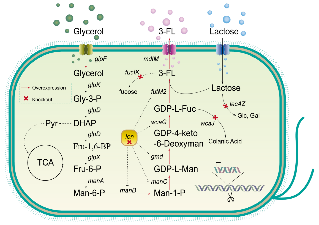 3-岩藻糖乳糖是母乳低聚糖的重要组成成分,对婴儿健康具有不可替代的重要作用。然而,由于从母乳中直接提取3-FL难度极大,其生物合成一直是科研领域的热点和难点问题。在本研究中,科研团队以大肠杆菌BL21 Star (DE3)为宿主,通过多策略优化,成功构建了一株能够高效合成3-FL的工程菌株,其在5 L生物反应器中发酵生产的3-FL产量高达60.24 g/L,创下目前报道的最高水平。