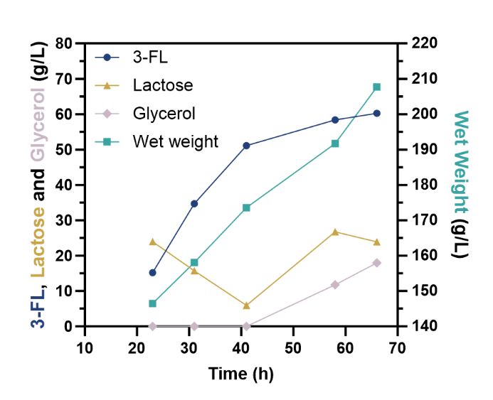 研究团队首先将3-FL生产模块整合到大肠杆菌中,并筛选出高效的α-1,3-岩藻糖转移酶。随后,通过优化前体合成基因簇和转移酶基因的整合位点,筛选出能够增强3-FL生产的转运蛋白和甘油利用基因。经过一系列的基因工程改造和发酵条件优化,最终获得了高产3-FL的菌株3FL05-1。在摇瓶发酵中,该菌株的3-FL产量达到了11.26 g/L,而在5L生物反应器中进一步放大生产时,3-FL产量更是达到了60.24 g/L,乳糖转化率达到68%,产率为0.19 g/L/h。