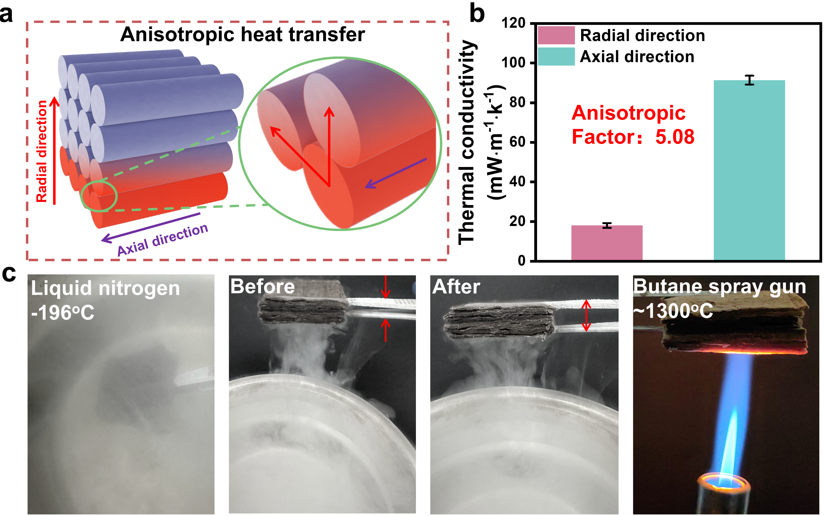 图2. 高取向 SiC@SiO2纳米纤维气凝胶各向异性热导率与极端热稳定性。