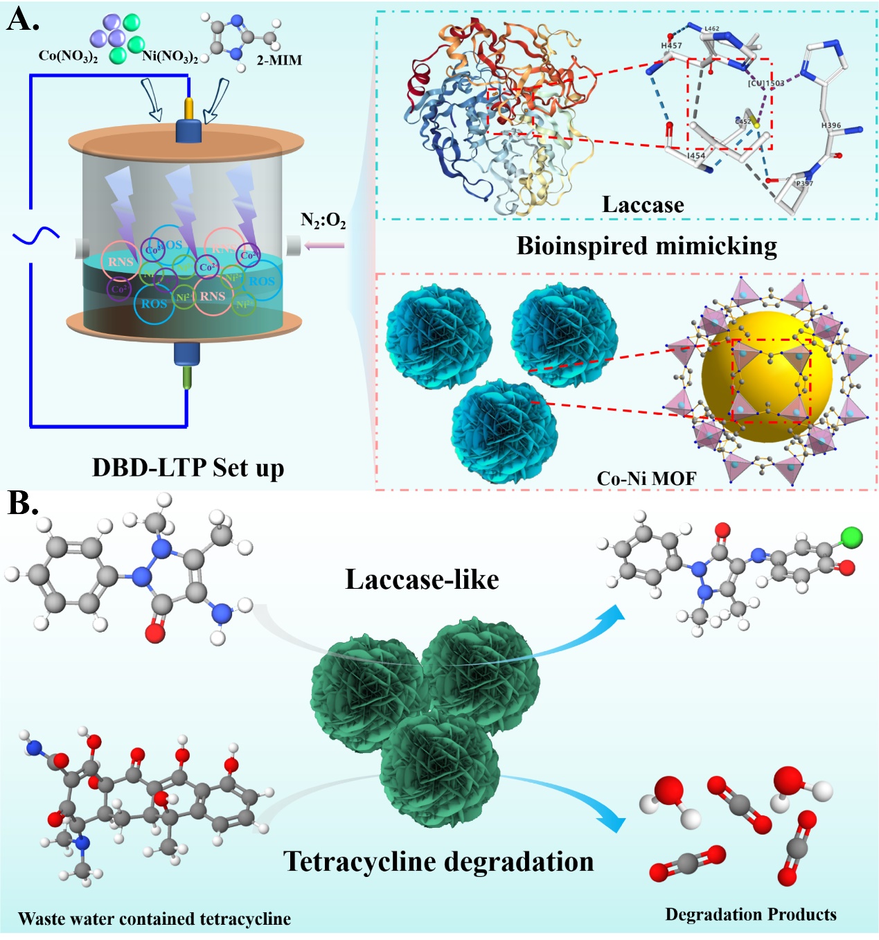 近年来,黄青课题组开展低温等离子体(LTP)技术的应用基础研究,在LTP制备纳米酶材料方面也做了许多新的尝试。在这项研究中,受天然绿色催化剂漆酶活性位点的启发,他们设计并利用低温等离子体 (LTP) 技术制备了一种双金属有机骨架材料 CoNi-MOF。该材料具有优异的类漆酶活性,能够有效催化高浓度四环素的降解反应,同时增强了对不同环境条件的耐受性、稳定性,并最大限度地降低了生物毒性。