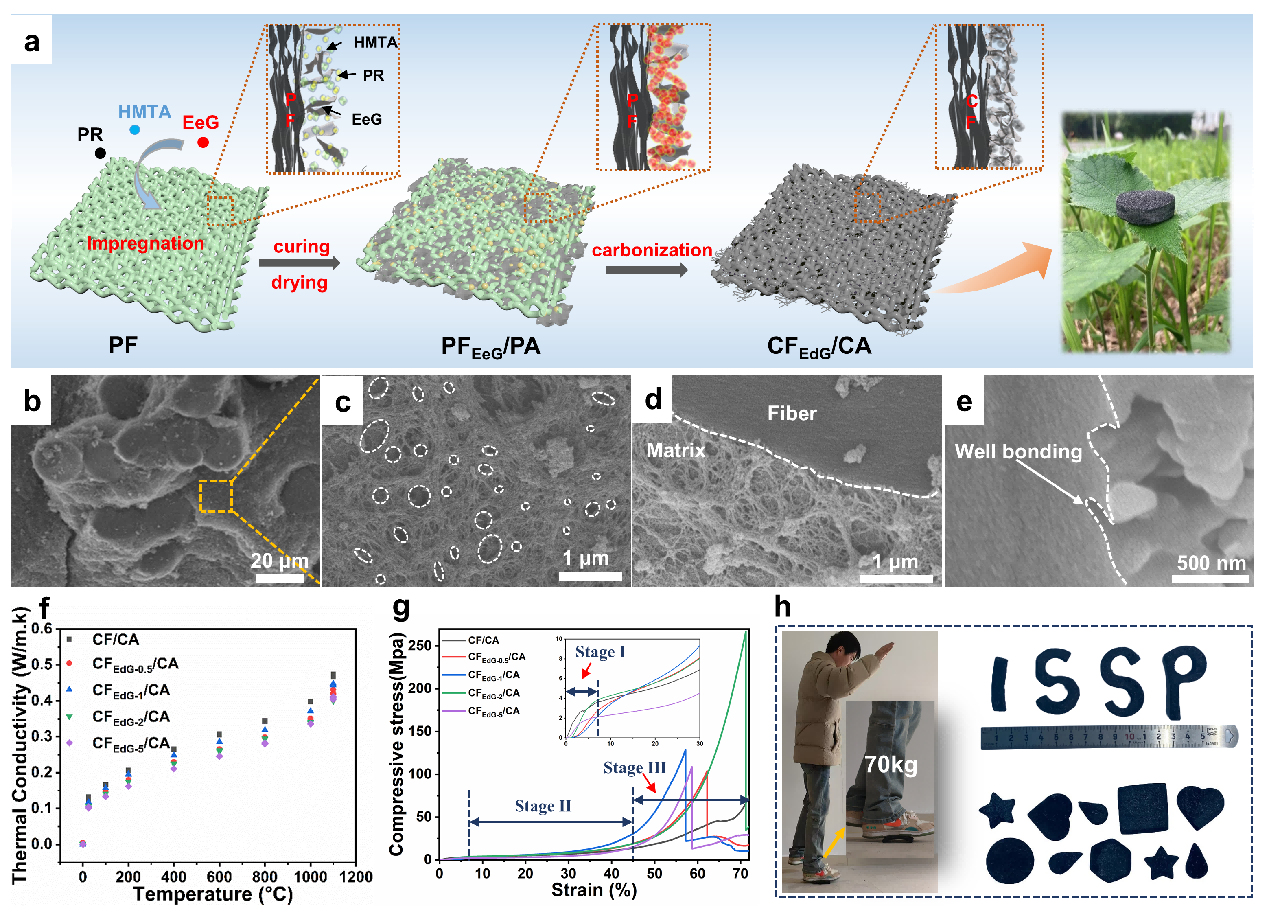 图1. 碳纤维增强碳基气凝胶复合材料的(a)制备流程图;(b-e)微观表征;(f)不同温度热导率;(g)压缩应力-应变曲线及(h)成型加工性能。