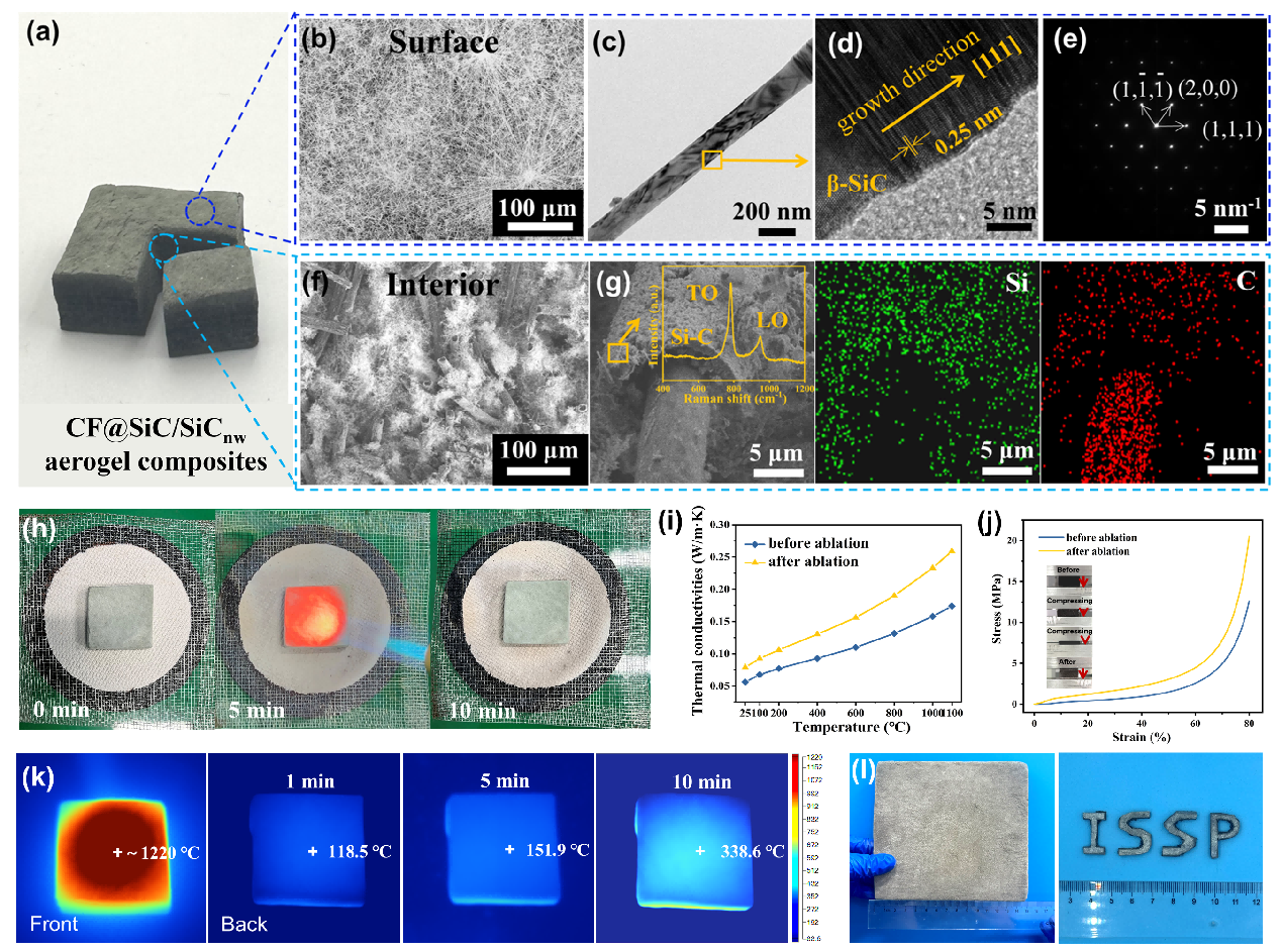 图2. 碳纤维增强SiC气凝胶复合材料的(a-g)微观表征;(h)抗烧蚀性能;(i)烧蚀前后不同温度的热导率;(j)烧蚀前后压缩应力-应变曲线;(k)高温隔热性能及(l)成型加工性能。