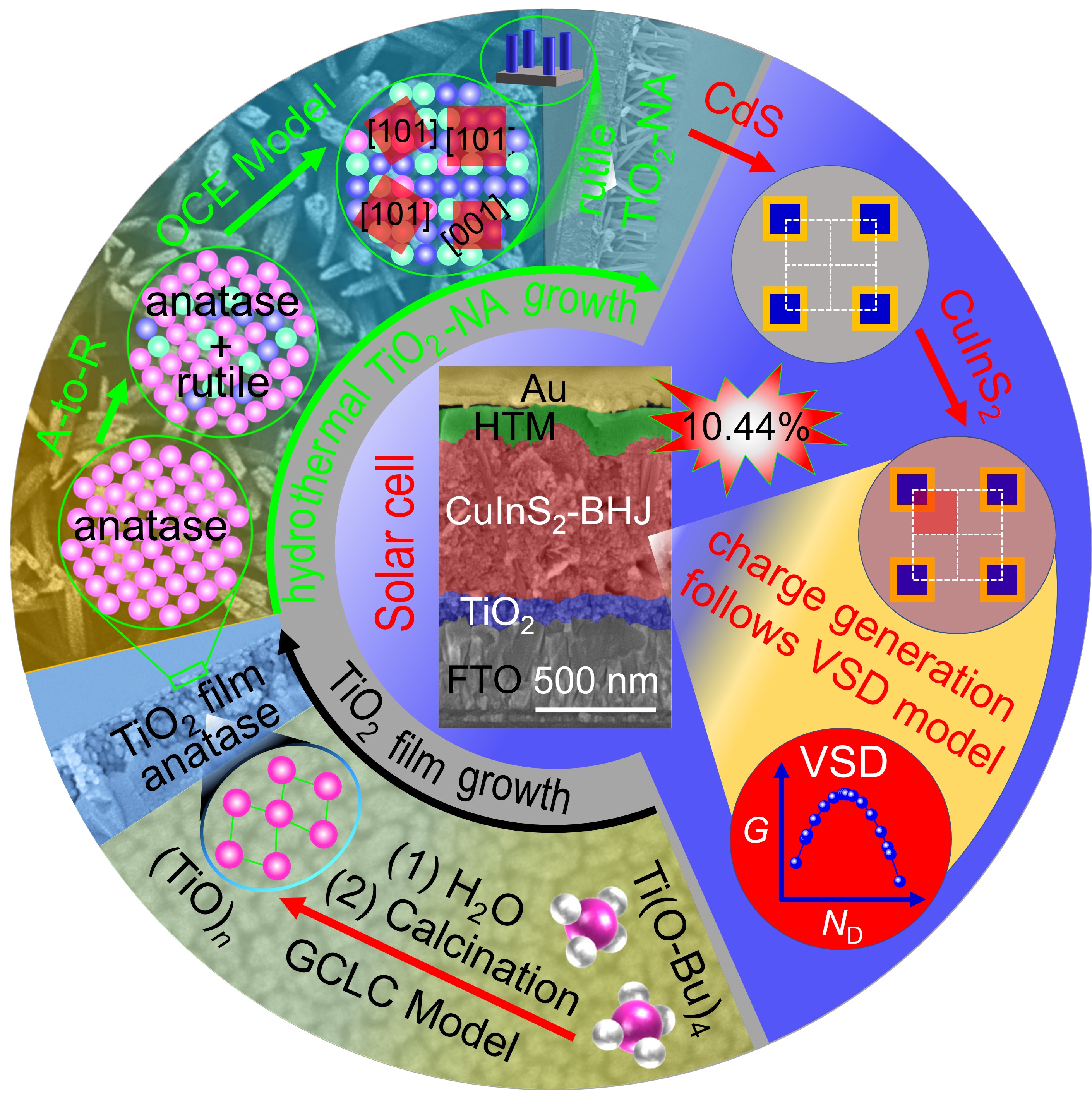 由于较大的锐钛矿TiO2纳米颗粒易发生原位A-to-R相变,TiO2-NA中ND可以通过tH得到有效调控。研究人员通过调控tH,结合一定的水热反应条件,在不改变直径和长度的情况下,实现了对TiO2-NA中的ND进行有效调控。进一步将ND调控的TiO2-NA用于构筑CuInS2太阳电池,提出了体积-面积-密度(VSD)多参数耦合模型,定量揭示了ND与光电流产生相关性的物理原理,首次在低温条件制备了效率大于10%的CuInS2太阳电池,并创造了新的CuInS2太阳电池光电转换效率记录(10.44%)。该VSD多参数耦合模型为设计体型异质结结构光电器件提供了理论基础。