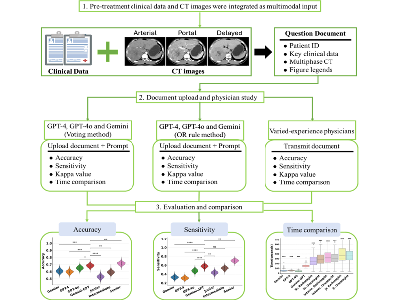 近年来快速发展的大语言模型(LLMs),包括GPT-4o、Google Gemini和DeepSeek等,由于其出色的文本、图像理解以及推理能力,为包括医学在内的各个领域带来了革命性的变化。在最近的一些AI+医学研究中,LLMs模型也已表现出熟练的病变检测和分类能力,但它们在复杂医学推理任务(如,基于多模态数据的HCC免疫疗法反应预测)中的准确性仍不确定。同时,临床专家如何更好地使用快速发展的LLMs工具,实现真正的临床混合智能决策也是一个重要的话题。