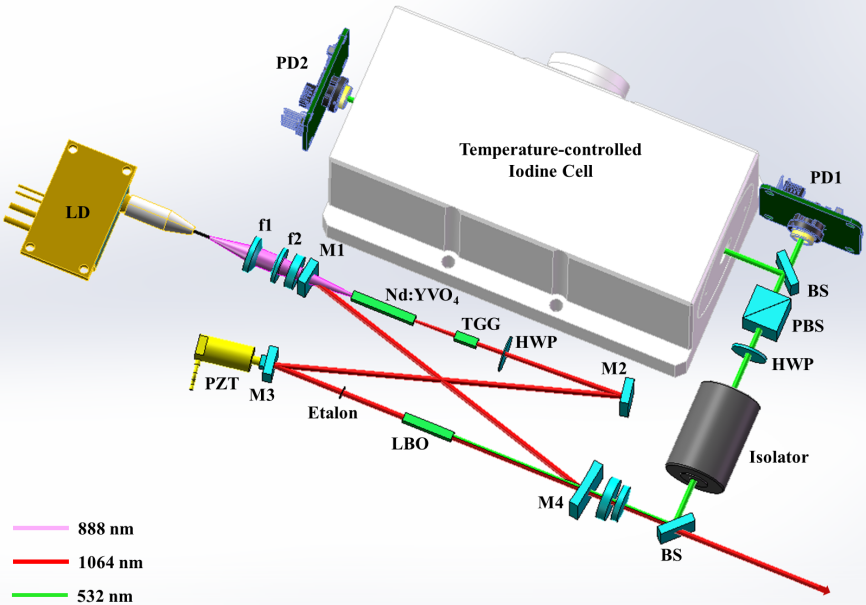 团队基于四镜环形腔采用单端LD泵浦Nd:YVO4(掺钕钒酸钇)晶体输出1064纳米连续单频激光,并结合碘分子锁频技术实现了输出激光频率锁定控制。研究成果有望成为大气污染和温室气体探测等环境监测仪器设备的核心器件,为大气环境保护和气候变化研究提供有力支持。